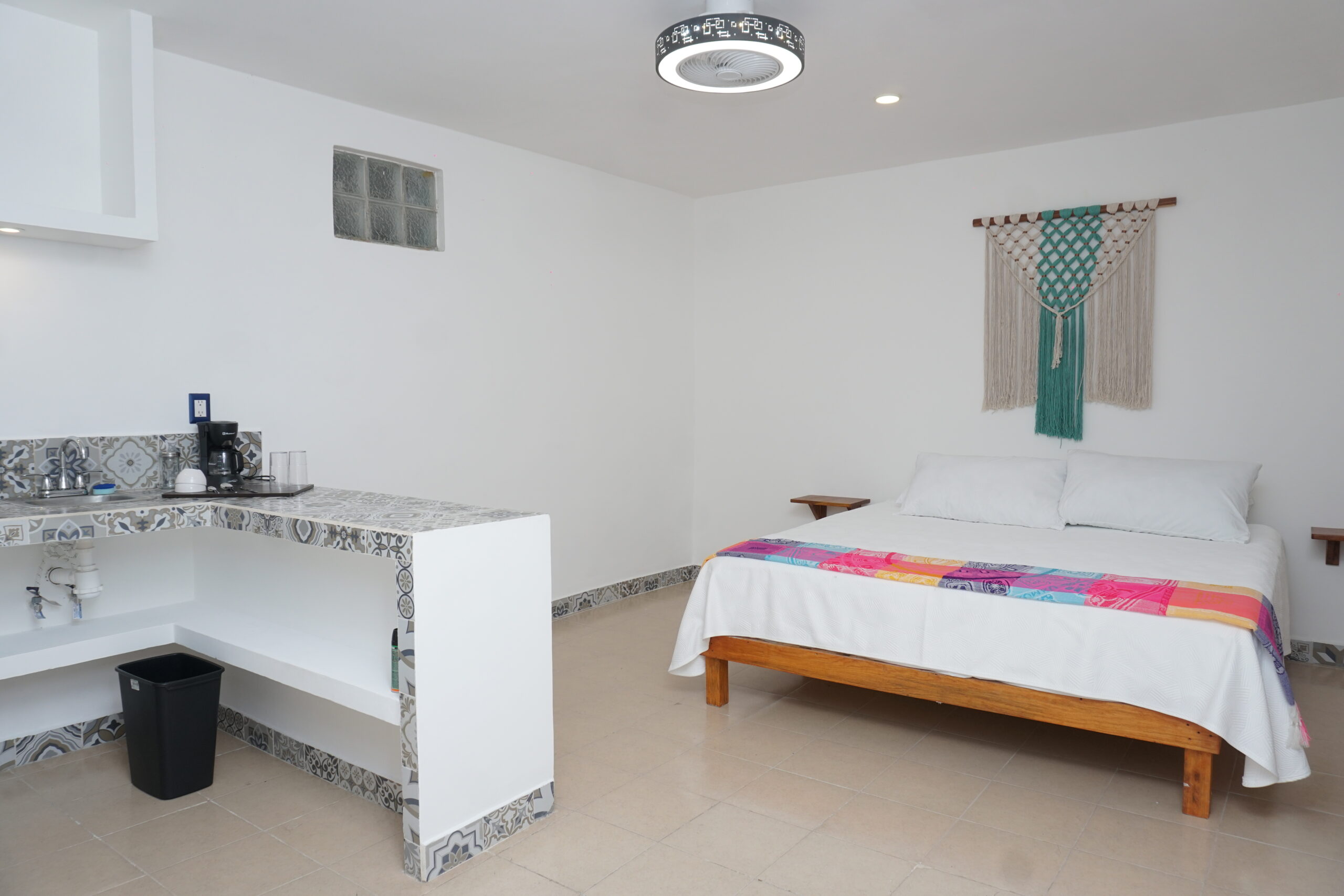 Habitación con 1 cama king size con repisa , cocineta y frigobar